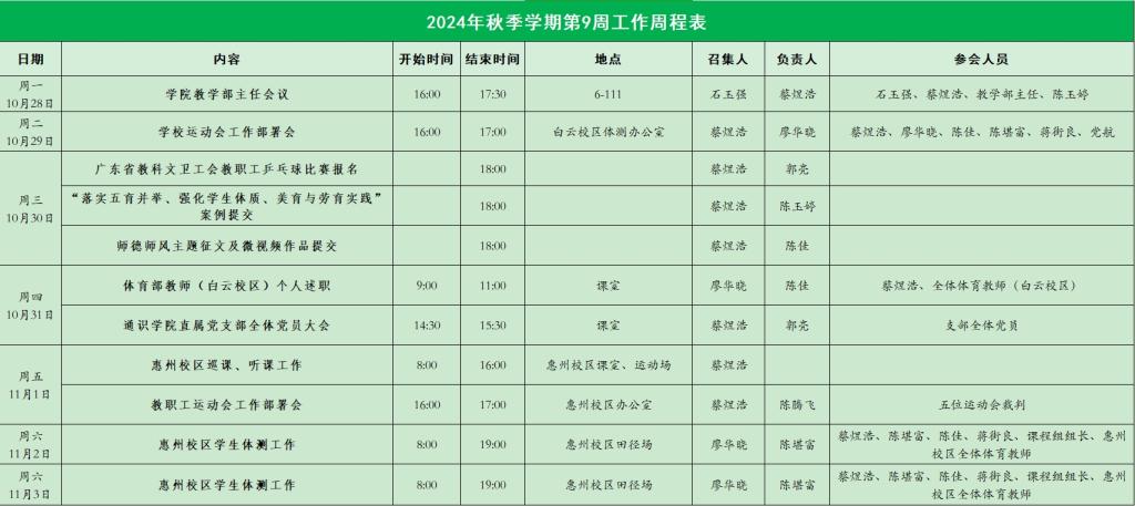 2024-2025学年第一学期威廉希尔中文网站第9周工作表