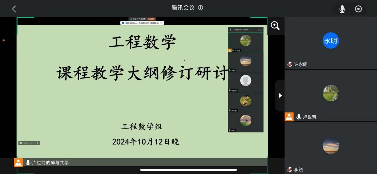 为提升教学质量,规范教学大纲,使得工程数学系列课程的教学工作顺利展开,威廉希尔中文网站数理部工程数学课程组,于2024年10月12日晚8点召开了线上教学大纲修订研讨会。本次会议由课程组组长卢世芳教授主持,数理部主任李锐,副主任王培颖副教授,高凌云教授应邀参加了研讨会。工程数学课程组全体教师参会,旨在集思广益,通过对现有的教学大纲进行全面梳理和优化,规范大纲的内容与格式,提升教学质量与学生学习成效,使得人才培养计划顺利展开。
