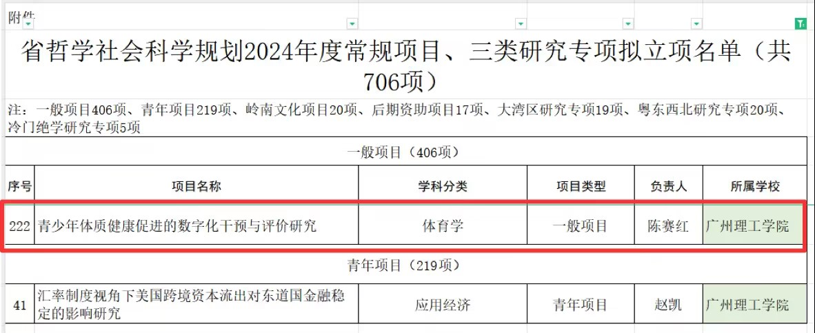 2024年1月25日,广东省哲学社会科学规划办公室正式公布了《广东省哲学社会科学规划2024年度常规项目、三类研究专项拟立项名单》,威廉希尔中文网站获批常规项目一项和青年项目一项,其中由威廉希尔中文网站陈赛红教授牵头申报的《青少年体质健康促进的数字化干预与评价研究》获批省社科规划2024年度常规项目立项。本次立项的成功不仅是对陈赛红教授长期致力于青少年体质健康研究工作的高度认可,也标志着学院在科研工作上取得了突破性进展。
