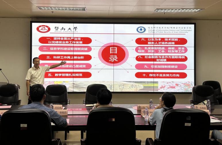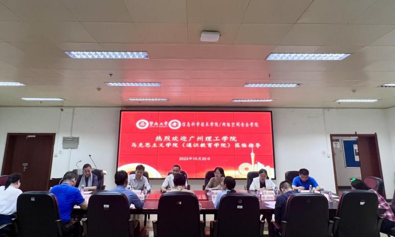 恰逢今年是习近平总书记视察暨南大学五周年,为深入学习贯彻习近平总书记重要讲话精神,10月20日,我院评建工作小组一行赴暨南大学参观学习。暨南大学体育学院党委书记马洁,暨南大学信息科学技术学院/网络空间安全学院党委书记罗国伟、副院长裴廷睿、党委副书记张艳丽、研究生管理办公室主任赵承想等人热情接待我院一行并座谈交流。