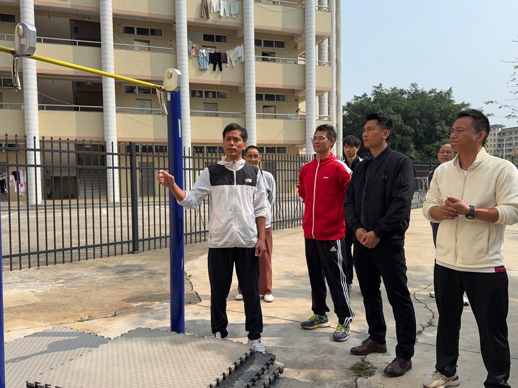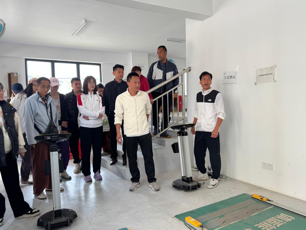 随后,培训进入核心环节——体测器材操作培训。陈堪富主任详细讲解引体向上测试仪、立定跳远测试仪等体测器材的正确操作方法。在立定跳远电子测量仪操作培训中,展示了如何精准识别学生起跳、落地位置,避免误判,以及数据的快速准确记录,确保教师能够熟练运用设备,为学生提供公平、准确的测试环境。