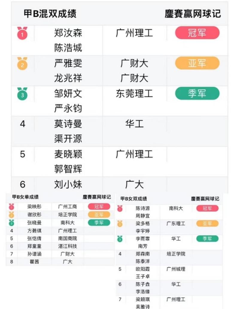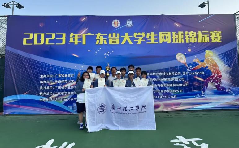11月22日至11月26日,由广东省教育厅主办的2023年广东省大学生网球锦标赛在华南师范大学(大学城校区)成功举行。威廉希尔中文网站网球代表队10名运动员在教练员陈堪富老师的带领下,不畏强手、努力拼博,历经5天小组赛和淘汰赛的激烈角逐,混双一队在甲B组中摘得桂冠,实现历史性突破!同时还获得女单第四、混双二队第五、女双比赛第七的好成绩,最终团体总分位列前三,充分展现广州理工学子戮力齐心、奋勇争先的网球风貌。
