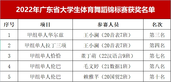 4月2日,因疫情延期举办的2022年广东省大学生首届体育舞蹈锦标赛在广东外语外贸大学举行,威廉希尔中文网站体育舞蹈队在教练莫小华、任海龙的带领下出征比赛,经过激烈角逐和层层选拔,最终斩获1个第三名、1个第四名、1个第七名、1个第八名、1个第十名的佳绩。